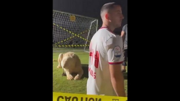 Μολονότι το λιοντάρι ήταν δεμένο σε ανύποπτη στιγμή αυτό έβγαλε ένα βρυχηθμό και, όπως φαίνεται στο βίντεο, ο Έλληνας ποδοσφαιριστής τα… χρειάστηκε.