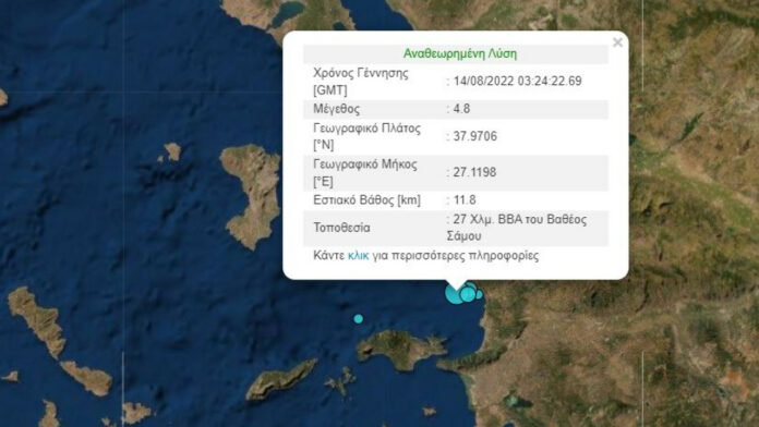 Σεισμική δόνηση μεγέθους 4,8 βαθμών της κλίμακας Ρίχτερ σημειώθηκε στις 06.24 το πρωί στη θαλάσσια περιοχή 27 χιλιόμετρα βορειοανατολικά της Σάμου.