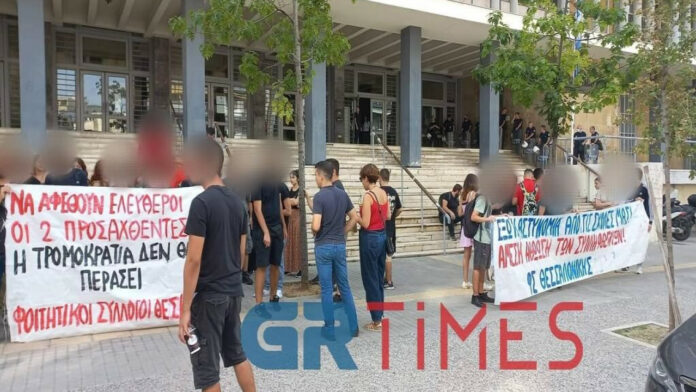 Eνόψει της μεταγωγής των τριών συλληφθέντων στον εισαγγελέα, μέλη φοιτητικών συλλόγων και αλληλέγγυοι πραγματοποίησαν συγκέντρωση έξω από τα Δικαστήρια Θεσσαλονίκης.