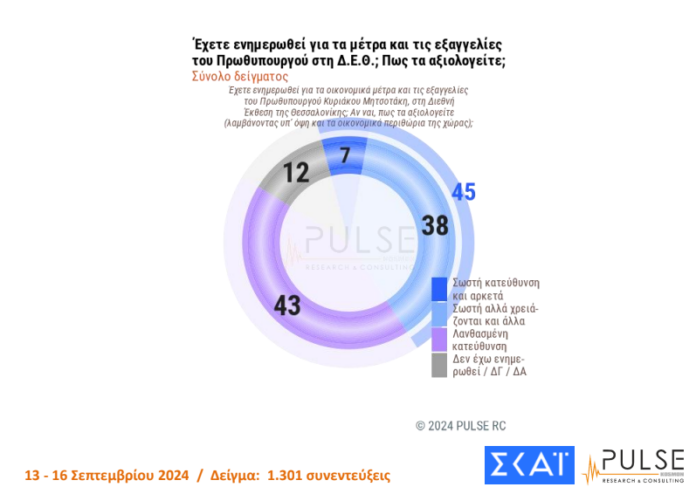 Η έρευνα της Pulse δείχνει μοιρασμένες τις εντυπώσεις των πολιτών από τις εξαγγελίες του Κυριάκου Μητσοτάκη στη ΔΕΘ. Το 45% τις αξιολογεί ως θετικές, ενώ το 43% αρνητικά.