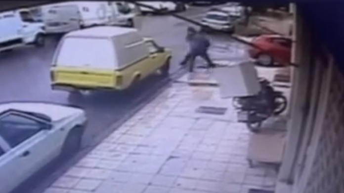 Ο δράστης φαίνεται να έρχεται από το απέναντι πεζοδρόμιο, να μαχαιρώνει τον υπάλληλο να παίρνει τα χρήματα και να τρέπεται σε φυγή