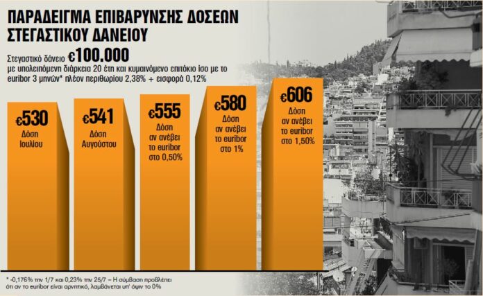 Από την άλλη, στα υφιστάμενα δάνεια κυμαινόμενου επιτοκίου οι δόσεις θα αυξηθούν από τον ερχόμενο μήνα, ανάλογα με τους όρους της σύμβασής τους. Το ετησιοποιημένο τελικό κόστος τους είναι συνδεδεμένο με τα διατραπεζικά επιτόκια euribor, που βρίσκονται ήδη από τον περασμένο Απρίλιο σε ανοδική τροχιά. Απλά μέχρι στιγμής δεν υπήρξαν μεταβολές στις δόσεις στην πλειονότητα των περιπτώσεων, καθώς οι εν λόγω δείκτες βρίσκονταν σε αρνητικό έδαφος. Πλέον όμως το euribor 3 μηνών διαμορφώνεται πάνω από το 0,20%.