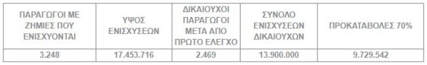 Το ύψος των εκταμιευόμενων προκαταβολών καθώς και οι παραγωγοί που κρίθηκαν δικαιούχοι επί του συνόλου των παραγωγών που υπέβαλαν δηλώσεις ζημιάς και διαπιστώθηκε ζημιά άνω του 30% απεικονίζονται στον ακόλουθο πίνακα: