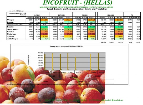 Συνεχίζεται η συγκομιδή θερινών φρούτων και λαχανικών με τις συνολικές τους εξαγωγές να είναι μειωμένες κατά 17,7% σε ποσότητες συγκριτικά με το 2020, χρονιά όπου υπήρξε κανονική παραγωγή, ενώ το 2021 «σημαδεύτηκε» από μεγάλες καταστροφές και σημαντικές απώλειες προϊόντων.