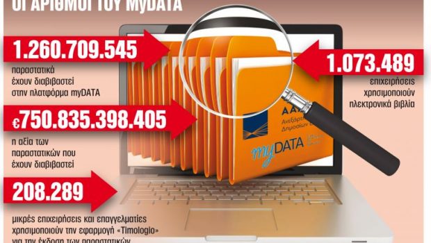 Σήμερα τo 70% των επιχειρήσεων υποχρεούται να αποστέλλει τα δεδομένα των λιανικών πωλήσεων το αργότερο εντός 24 ωρών στην ψηφιακή πλατφόρμα «myDATA». Μάλιστα, οι επιχειρήσεις που βρίσκονται στην κόκκινη ζώνη της φοροδιαφυγής είναι υποχρεωμένες να διαβιβάζουν ταχύτερα τα δεδομένα των αποδείξεων που κόβουν στην ΑΑΔΕ.