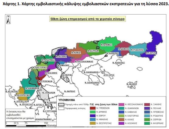 Οι ΠΕ, στις οποίες θα διενεργηθεί το πρόγραμμα του δια του στόματος εμβολιασμού των κόκκινων αλεπούδων κατά της λύσσας την άνοιξη και το φθινόπωρο του 2023, απεικονίζονται στον πίνακα 1 και τον χάρτη 1 (επισημασμένες με χρώμα περιοχές) της παρούσας και είναι οι παρακάτω: Θεσσαλονίκης (τμήμα αυτής), Κιλκίς, Σερρών (τμήμα αυτής), Πέλλας, Ημαθίας (τμήμα αυτής), Κοζάνης, Γρεβενών (τμήμα αυτής), Καστοριάς, Φλώρινας, Θεσπρωτίας, Ιωαννίνων (τμήμα αυτής), Πρέβεζας (τμήμα αυτής), Ροδόπης, Ξάνθης, Έβρου, Καβάλας (τμήμα αυτής) και Δράμας.