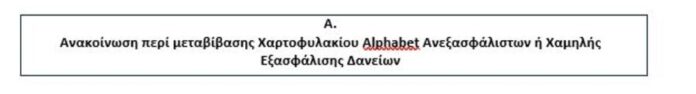 Tην 15η-11-2024 έλαβε χώρα η πώληση και μεταβίβαση απαιτήσεων από μικτό χαρτοφυλάκιο μη εξυπηρετούμενων και εξυπηρετούμενων δανείων (επιχειρηματικών και λιανικής τραπεζικής) ως επί το πλείστον ανεξασφάλιστων ή με χαμηλή εξασφάλιση, που είχαν χορηγήσει τα παραπάνω Πιστωτικά Ιδρύματα ΥΕΕ (στο εξής οι «Απαιτήσεις Χαρτοφυλακίου Alphabet Ανεξασφάλιστων ή Χαμηλής Εξασφάλισης Δανείων»).