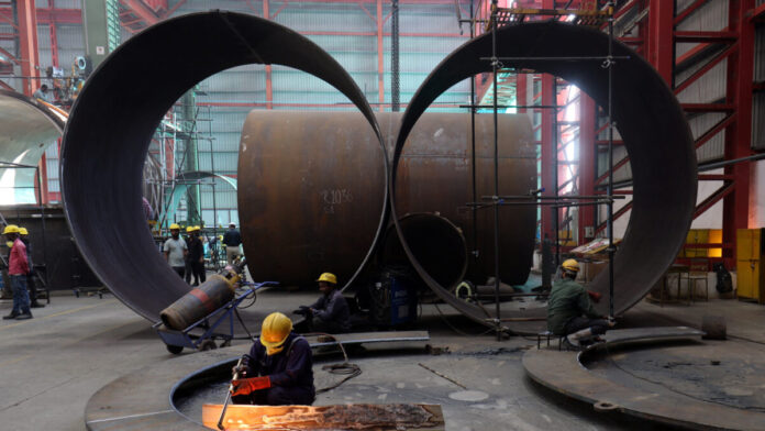 A worker cuts a metal plate inside an industrial tank manufacturing factory on the outskirts of Ahmedabad, India, January 31, 2025. REUTERS/Amit Dave