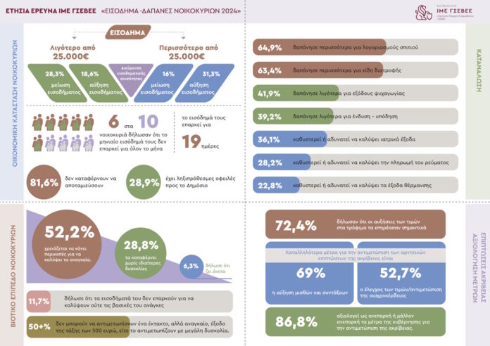 Η οικονομική πίεση παραμένει έντονη στην κοινωνία, με το 60% των νοικοκυριών να δηλώνει ότι το εισόδημά του δεν επαρκεί για όλον τον μήνα και το 81,6% να αδυνατεί να αποταμιεύσει. Επιπλέον, το 11,7% ζει σε συνθήκες ακραίας φτώχειας.