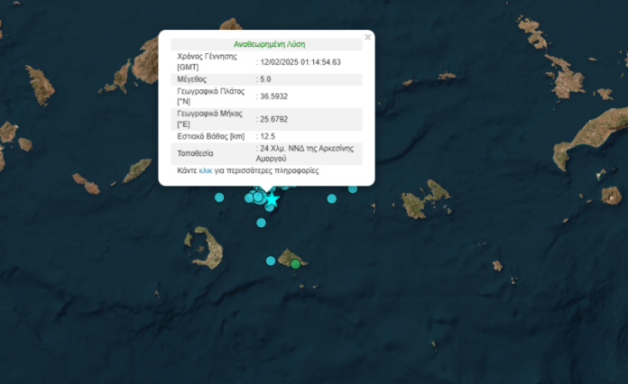 Η σεισμική δόνηση είχε μέγεθος 5,0 βαθμών της κλίμακας Ρίχτερ και εντοπίστηκε 24 χλμ. ΝΝΔ της Αρκεσίνης Αμοργού