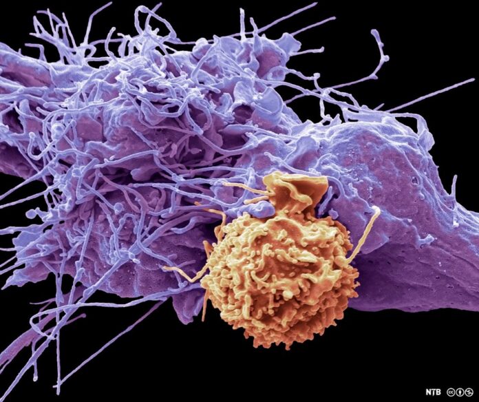 Κύτταρο του ανοσοποιητικού (πορτοκαλί) επιτίθεται σε καρκινικό κύτταρο