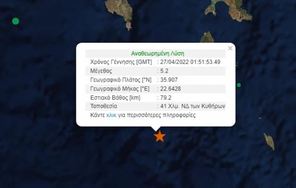 Σεισμική δόνηση 5,2 βαθμών της κλίμακας Ρίχτερ, που χαρακτηρίζεται «ισχυρή», σημειώθηκε λίγο πριν από τις 05:00 (στις 04:51) στον θαλάσσιο χώρο 41 χιλιόμετρα νοτιοδυτικά των Κυθήρων (249 χιλιόμετρα νότια-νοτιοδυτικά της Αθήνας), σύμφωνα με ανακοίνωση του Γεωδυναμικού Ινστιτούτου του Εθνικού Αστεροσκοπείου Αθηνών.