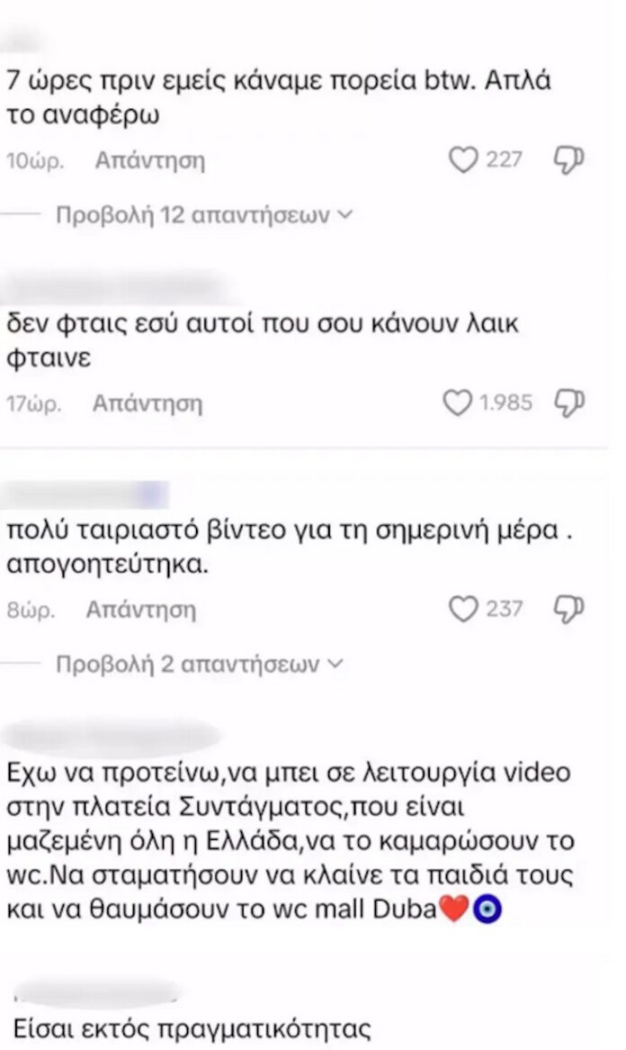 «7 ώρες πριν, εμείς κάναμε πορεία», γράφει κάποιος, ενώ ένας άλλος πρόσθεσε: «Σε λυπάμαι, ζεις στον κόσμο σου. Δες τι γίνεται στη χώρα σου». Άλλο σχόλιο γράφει: «Πολύ ταιριαστό βίντεο για τη σημερινή ημέρα, απογοητεύτηκα».