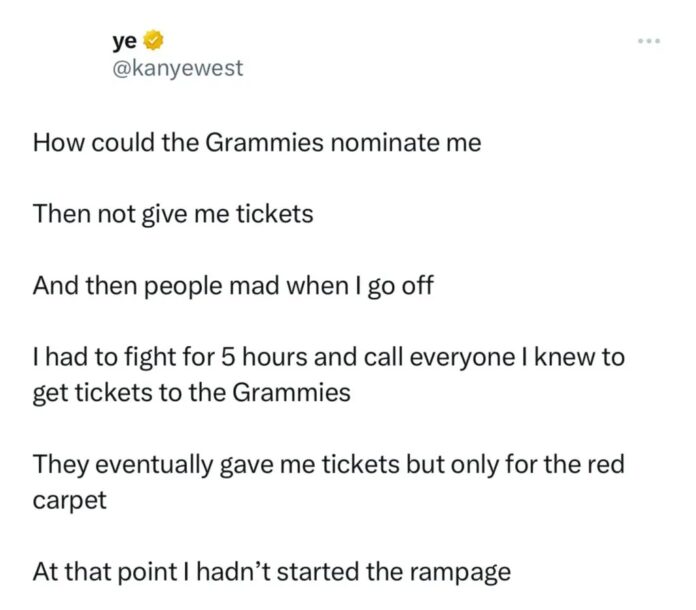 «Πώς θα μπορούσαν τα Grammies να με προτείνουν και μετά να μη μου δίνουν εισιτήρια και μετά να αναρωτιούνται γιατί εξοργίζομαι», έγραψε ο Kanye West μέσω του X το Σάββατο (15.02.2025) για την εκδήλωση των βραβείων, που συνοδευόταν από την Bianca Censori, στις 2 Φεβρουαρίου.